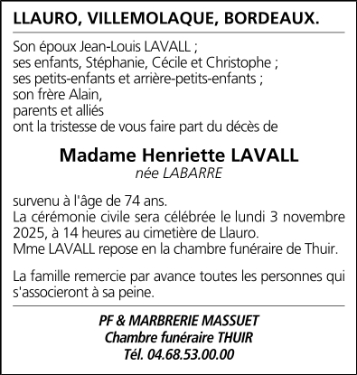 Décédée à Llauro (66300, France) le jeudi 30 octobre 2025 à l'âge de 74 ans