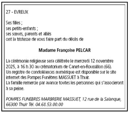 Décédée à Perpignan (66000, France) le samedi 1 novembre 2025 à l'âge de 77 ans