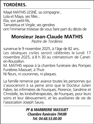 Décédé à Tordères (66300, France) le dimanche 9 novembre 2025 à l'âge de 82 ans