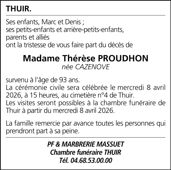 Décédée à Thuir (66300, France) le samedi 4 avril 2026 à l'âge de 93 ans