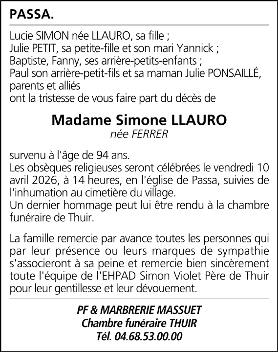 Décédée à Thuir (66300, France) le mardi 7 avril 2026 à l'âge de 94 ans
