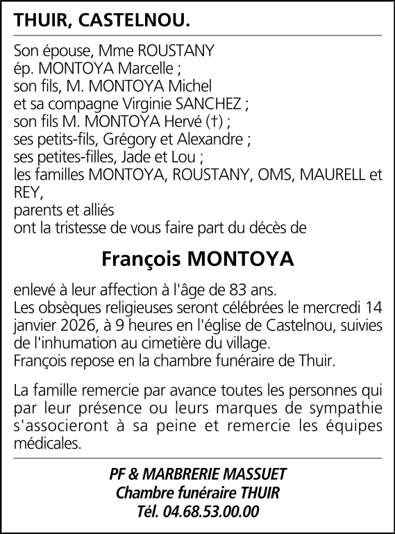 Décédé à Thuir (66300, France) le samedi 10 janvier 2026 à l'âge de 83 ans
