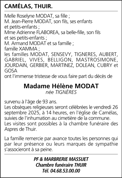 Décédée à Thuir (66300, France) le mercredi 24 septembre 2025 à l'âge de 93 ans