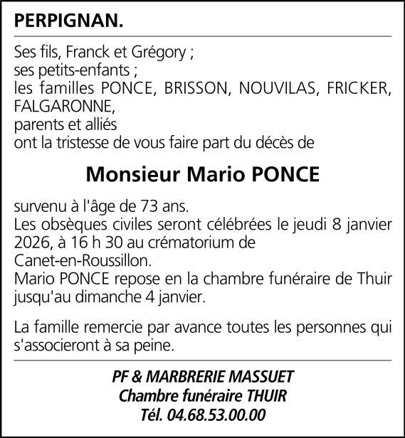 Décédé à Perpignan (66000, France) le lundi 29 décembre 2025 à l'âge de 73 ans
